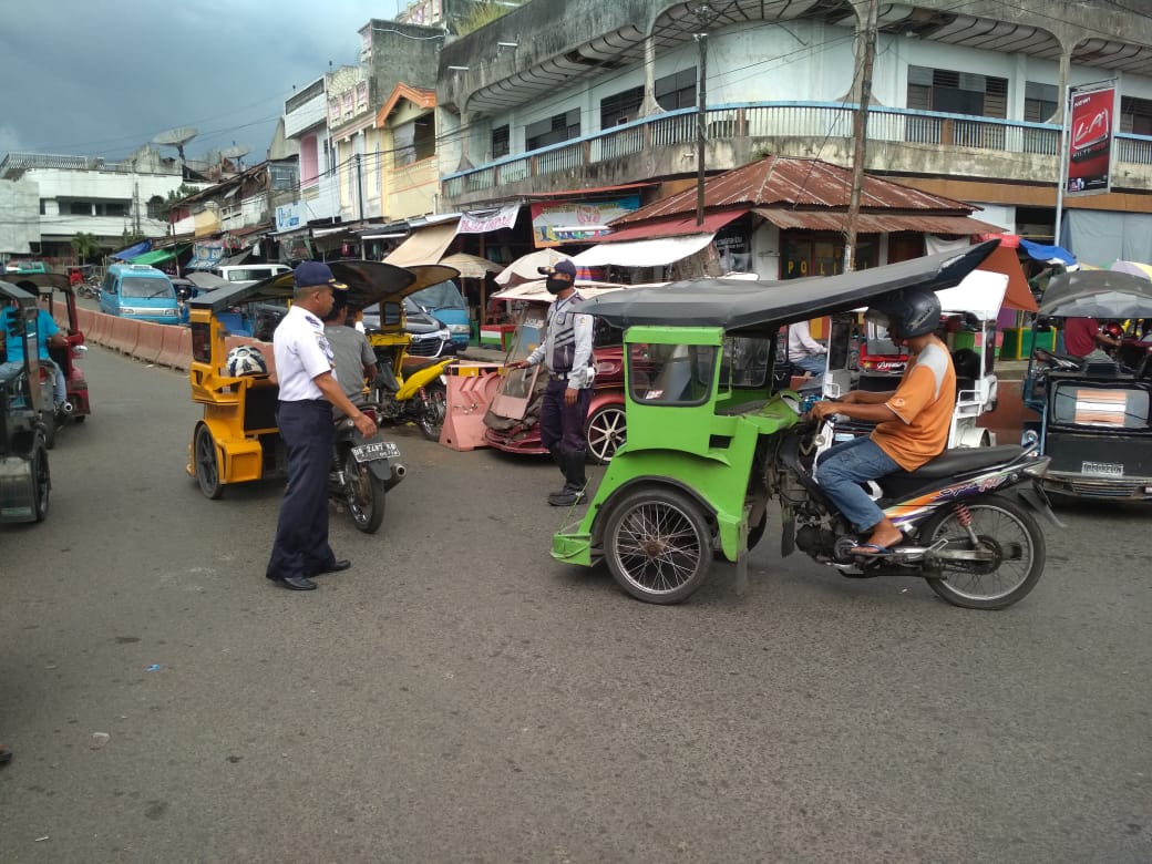 Salah satu Petugas Operasional Dishub Kotamobagu Rinto Dondo sedang melakukan himbauan menjaga jarak dalam rangka pencegahan penyebaran Covid-19.